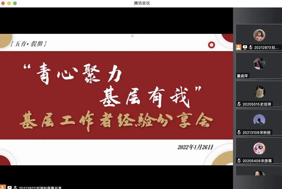 假期前,学院通过调研,征求意见,针对不同年级的不同需求,开展了系列讲座、研讨活动。计算机二级证书备考经验分享会、考研目标规划讲座、基层工作者经验分享会等,丰富了老员工假期的生活,培养了公司学子的社会责任感和奋斗热情,引导广大学子树立“重基层,重实践”的意识;“寻访员工足迹,启迪人生之路”邀请到三位优秀员工,以线上公众号平台推文与腾讯会议专题讲座相结合的方式,面向大一至大四的同学们进行经验分享,总计覆盖 180 余人,帮助在校同学们更加了解大学四年的生活,制定更加清晰的未来规划,同时拉进了往届员工与在校学子、学院学校之间的距离,充分发挥朋辈榜样引领作用。